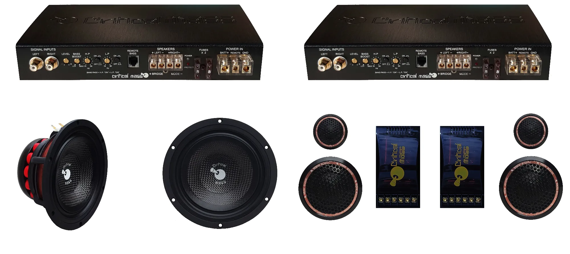 1x ELS-1000.2 set to : High Pass @ 1200Hz for the midrange and tweeter being crossed over with the included 2 way crossover